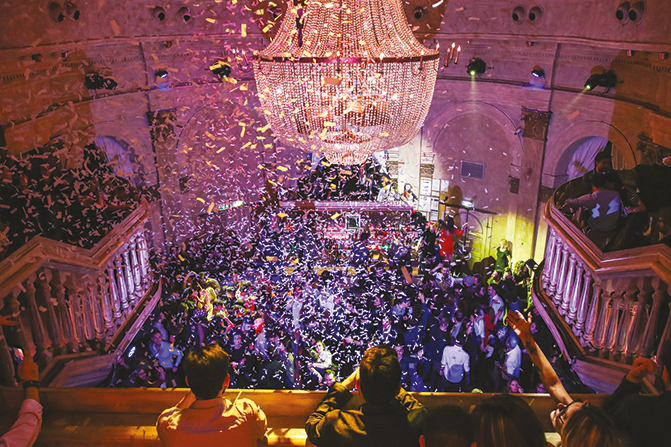 Le DJ prend place là où l’autel dominait autrefois, un geste audacieux, mais maîtrisé, comme une réinterprétation profane de la liturgie du lieu. Les lignes contemporaines du comptoir, épurées, mais lumineuses, dialoguent avec les éclats d’orne- mentation baroque qui persistent sur les parois. Le jeu est subtil : jamais pastiche, jamais effacement, plutôt une cohabitation respectueuse où chaque époque semble amplifier l’autre. Au-dessus, d’anciens puttis sculptés surveillent les cocktails tels de petits gardiens ironiquement indulgents.