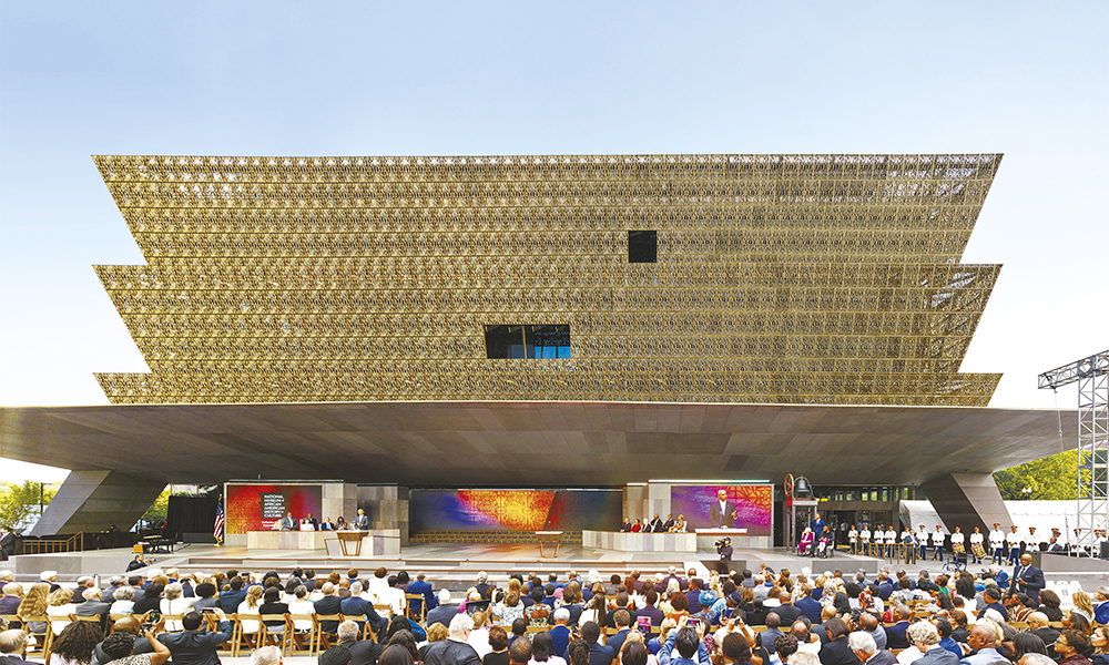 En partie parce qu’il occupe le dernier site disponible sur le Mall à Washington D.C., le cœur du fameux plan de la capitale américaine dessiné en 1791 par le Major Pierre-Charles L’Enfant, le nouveau Smithsonian National Museum of African American History and Culture (NMAAHC) doit être considéré comme la réalisation la plus importante de David Adjaye. Inauguré par le président Obama le 24 septembre 2016, le NMAAHC a reçu presque 2,5 millions de visiteurs lors de sa première année d’activité. D’une superficie de plus de 39 000 mètres carrés, le bâtiment a coûté la bagatelle de 540 millions de dollars, dont la moitié environ financée par le gouvernement des États-Unis, et le reste par le Smithsonian et des dons privés. La structure est pour l’essentiel une boîte en acier et en verre. Le tout est revêtu de 3 600 panneaux ajourés en aluminium, enduits de bronze. En réalité, l’architecte souhaitait faire fabriquer ces panneaux en bronze. Il explique que cette solution n’a pas été retenue, car le Smithsonian exigeait une garantie de cinquante ans sur le bâtiment, et en raison du poids du bronze, personne ne voulait garantir sur une aussi longue période la solidité des fixations d’où le choix final de l’aluminium (10 à 20 fois moins lourd) couleur bronze. Il faut souligner, même sur le plan symbolique, que ce choix tranche visiblement avec le marbre blanc qui domine les monuments et les autres bâtiments du Mall.