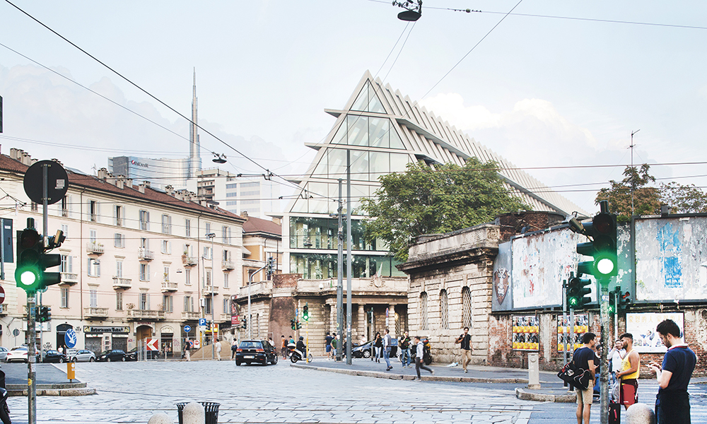 Feltrinelli Porta Volta, Milan. Conçue pour la Fondazione Giangiacomo Feltrinelli, la structure s’adapte entièrement à son site historique, et s’inspire de par ses volumes de monuments tels que l’Ospedale Maggiore, la Rotonda della Besana, et le Castello Sforzesco, selon les architectes.