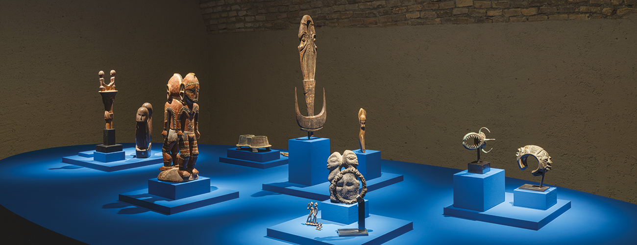 Paul Maheke a choisi des couleurs vives qui tranchent avec les scénographies habituelles des expositions ethnographiques. Comme ici où le bleu relie le monde des morts avec celui des vivants.