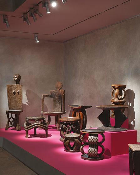 Il y a d’abord des questions très formelles : les couleurs, les sen- sations, l’émotion, ou encore la chorégraphie des espaces. J’aime réfléchir à la manière dont le spectateur découvre une exposition : quels objets verra-t-il en premier, comment son regard va-t-il circuler ? La question du parcours et la façon dont les gens allaient appréhender ce lieu étaient très importantes. Il y a des aspects plus ésotériques liés aux auras et aux récits parfois inconnus qui accompagnent ces objets. L’idée était aussi de les laisser parler et de ne pas les surcharger de discours. Avec Séverine Fromaigeat, on a, par exemple, décidé d’utiliser la salle à l’entrée comme un espace de bienvenue. Les visiteurs sont accueillis par une série de sièges et de trônes, un peu comme s’ils étaient reçus par une com- munauté de chefs pour lesquels ces objets ont été créés. Certains sont fonctionnels, d’autres ornementaux et viennent de régions très différentes. Les formes sont minimalistes, avec peu de figuration. Les motifs géométriques des tabourets ont aussi quelque chose de très fort, de presque spirituel. On voulait éveiller les imaginaires dès l’arrivée des spectateurs dans l’exposition.