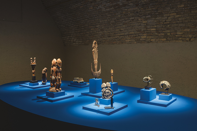 Je voulais m’éloigner des codes habituels des musées ethnographiques où les murs prennent des tons neutres, un peu « naturalistes », en proposant quelque chose de plus vibrant, de plus actuel, des couleurs capables « d’activer » les objets. Je les ai choisies en fonction des sensations que chaque salle devait pro- voquer. Celle-ci, par exemple, est consacrée à la célébration, à la danse, à la musique : d’où ce rose fuchsia pétulant. Dans la précédente, le bleu relie les étages, du sous-sol jusqu’à la lumière du rez-de-chaussée, une manière de connecter le monde des morts avec celui des vivants. Dans la suivante, c’est le vert qui domine pour évoquer la forêt de manière assez littérale. J’y montre des lances et des boucliers en bois ou en fibre végétale qui ne sont pas toujours de vraies armes, mais des symboles de pouvoir, des ornements liés à un statut social. Ces objets racontent quelque chose du corps, de la communauté, de la danse aussi, parce que dans beaucoup de cultures, un bon guerrier, c’est aussi un bon danseur. Ces objets viennent de plusieurs régions d’Afrique, mais aussi d’Océanie. Exposés à la verticale, ils for- ment une sorte de forêt métaphorique. D’un point de vue purement plastique, j’aimais aussi l’idée de créer un contraste avec les matériaux du musée lui-même – la brique, les murs sourds et un peu mats – en y insuf- flant quelque chose de plus dynamique et de presque chorégraphique.