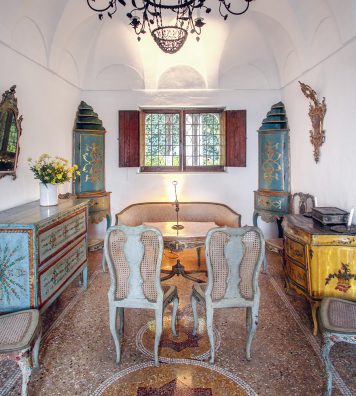 A quelques pas de là, le salon français et le salon vénitien se dévoilent. Ces deux pièces en enfilade accueillaient notamment les hôtes d’Axel Munthe. Dans cette partie de la villa, le mobilier du XVIIIe siècle, provenant d’Italie ou d’Angleterre, côtoie les vestiges gréco-romains, et notamment une impressionnante tête de Méduse.